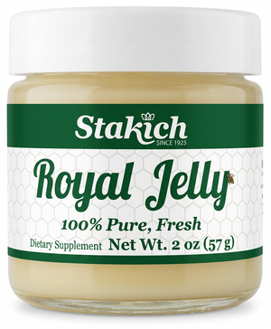 Stakich Royal Jelly is a nutrient-rich food packed with all of the naturally occurring B-vitamins, nucleic acid, essential amino acids, fatty acids, enzymes, essential vitamins and minerals. It is the Queen Bee's only source of food, which enables her to live...